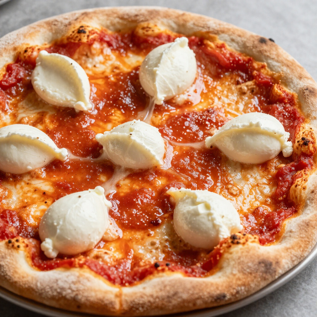 Creamy garlic ricotta base, fresh mozzarella, parmesan, and a sprinkle of oregano.